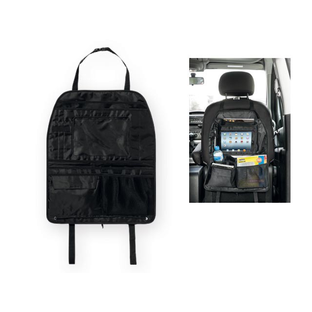 Organizér na sedadlo auta s množstvom vreciek na uloženie vecí a priestorom na tablet uzatvárateľným na suchý zips. Na spodnom okraji je šnúrka na pripevnenie organizéra k sedadlu.