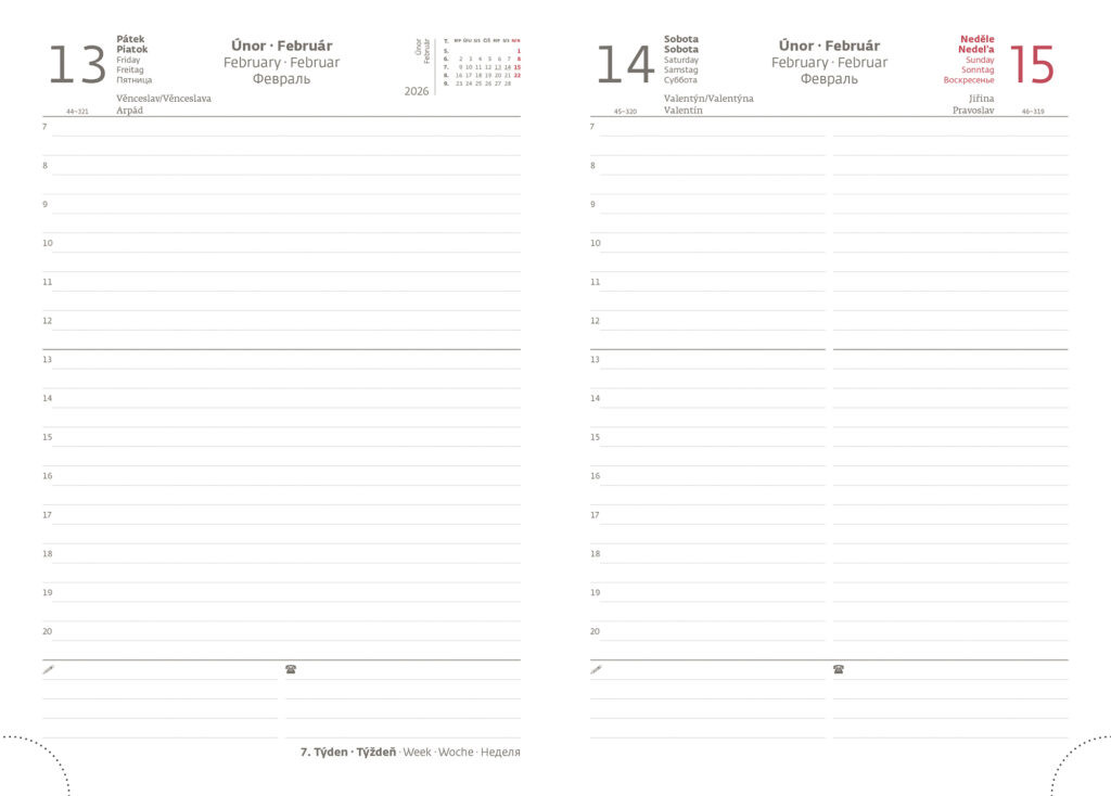 Formát diára: 145 x 205 mm Rozsah diára: 352 strán Kalendárium: denné Ekologické dosky diára sú recyklovateľné, ich materiál je biologicky odbúrateľný a pri ich výrobe boli použité obnoviteľné energie.Celý diár má certifikáciu FSC™. Pri výrobe povrchu dosiek bolo až 55 % celulózy zo stromov nahradené biologicky rozložiteľným odpadom a recyklovanými vláknami. Konkrétne boli použité zvyšky kávy, levandule a kivi, recyklované vlákna a celulóza zo šetrne obhospodarovaných lesov. Povrchový materiál je vyrábaný pomocou obnoviteľnej energie, pričom vzniknuté emisie sú plne kompenzované. Diár obsahuje: osobné údaje, plánovač dovolenky (mesačný prehľad), plánovací kalendár, telefónne predvoľby, štátne sviatky Českej a Slovenskej republiky, medzinárodné sviatky, ročný výhľad , denný layout, adresár, mapa Európy a Českej a Slovenskej republiky. Nutnosť nákupu v počte 5 ks alebo násobkoch tohto čísla.