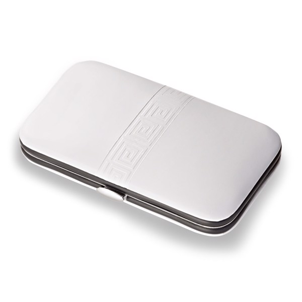 Päťdielna manikúrová súprava s pilníkom na nechty, nožničkami, klieštikmi na nechty, pinzetou a zatláčadlom kožičky. Dodáva sa v PU puzdre. 110 x 65 x 20 mm