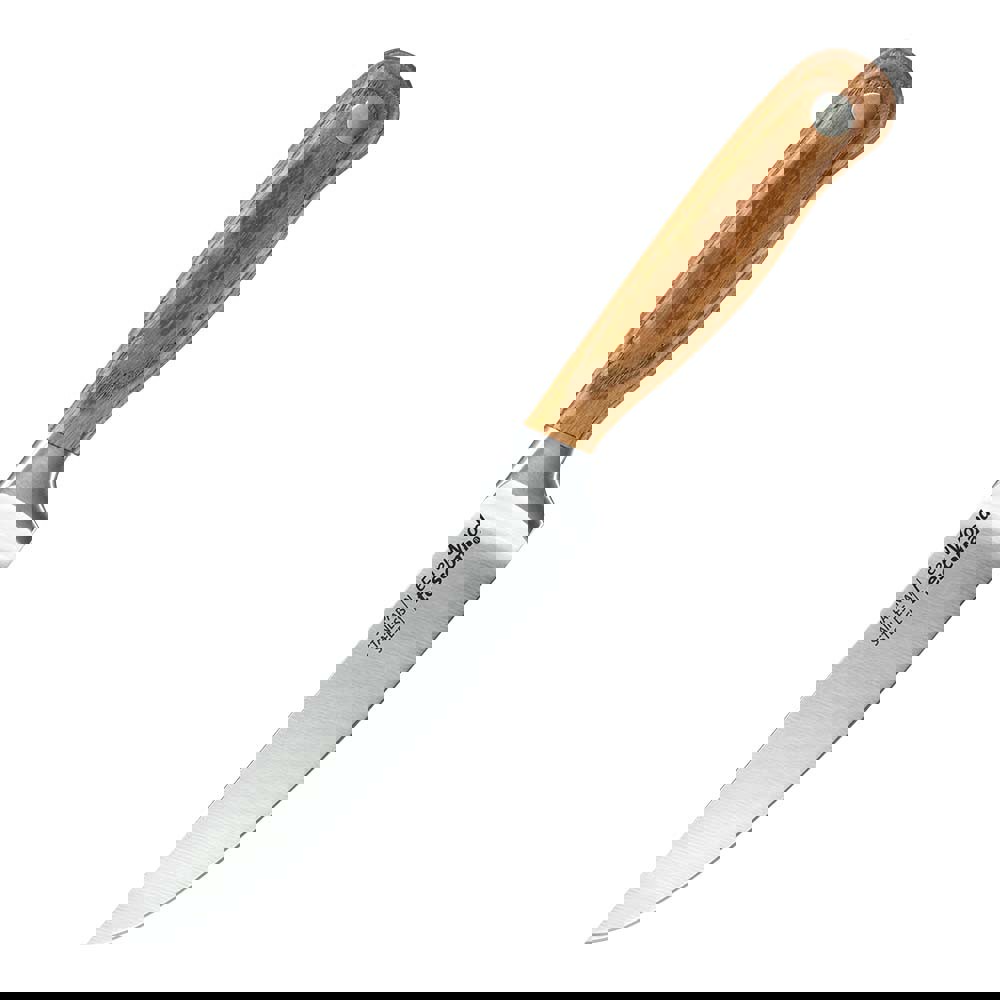 Kuchynský nôž s elegantnou drevenou rukoväťou, masívna kovaná čepeľ s „V“ profilom vyrobená z prvotriednej nehrdzavejúcej nožiarskej ocele s dokonalým ostrím. Rukoväť vyrobená zo špeciálne tvrdeného jaseňového dreva. Dĺžka čepele 130 mm.