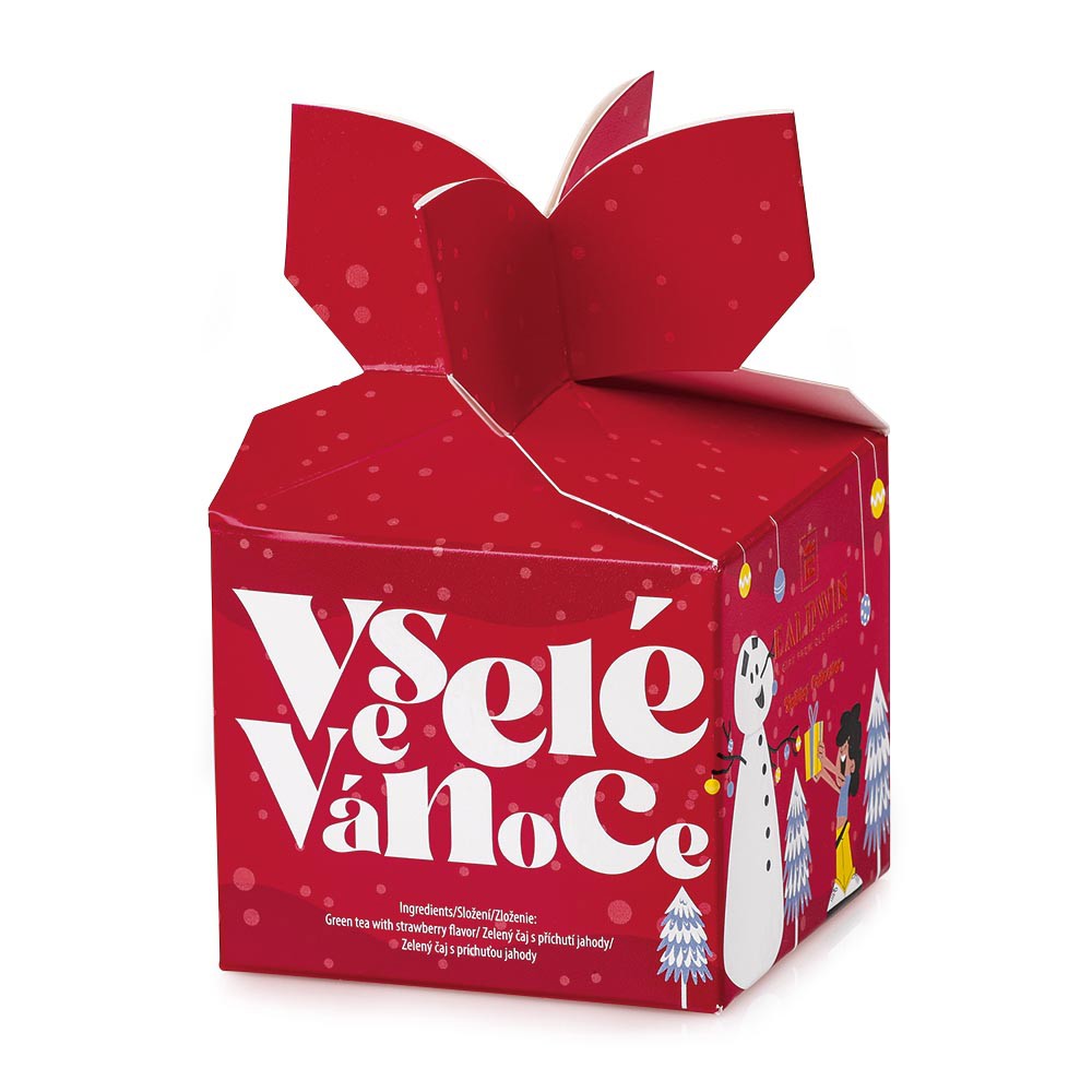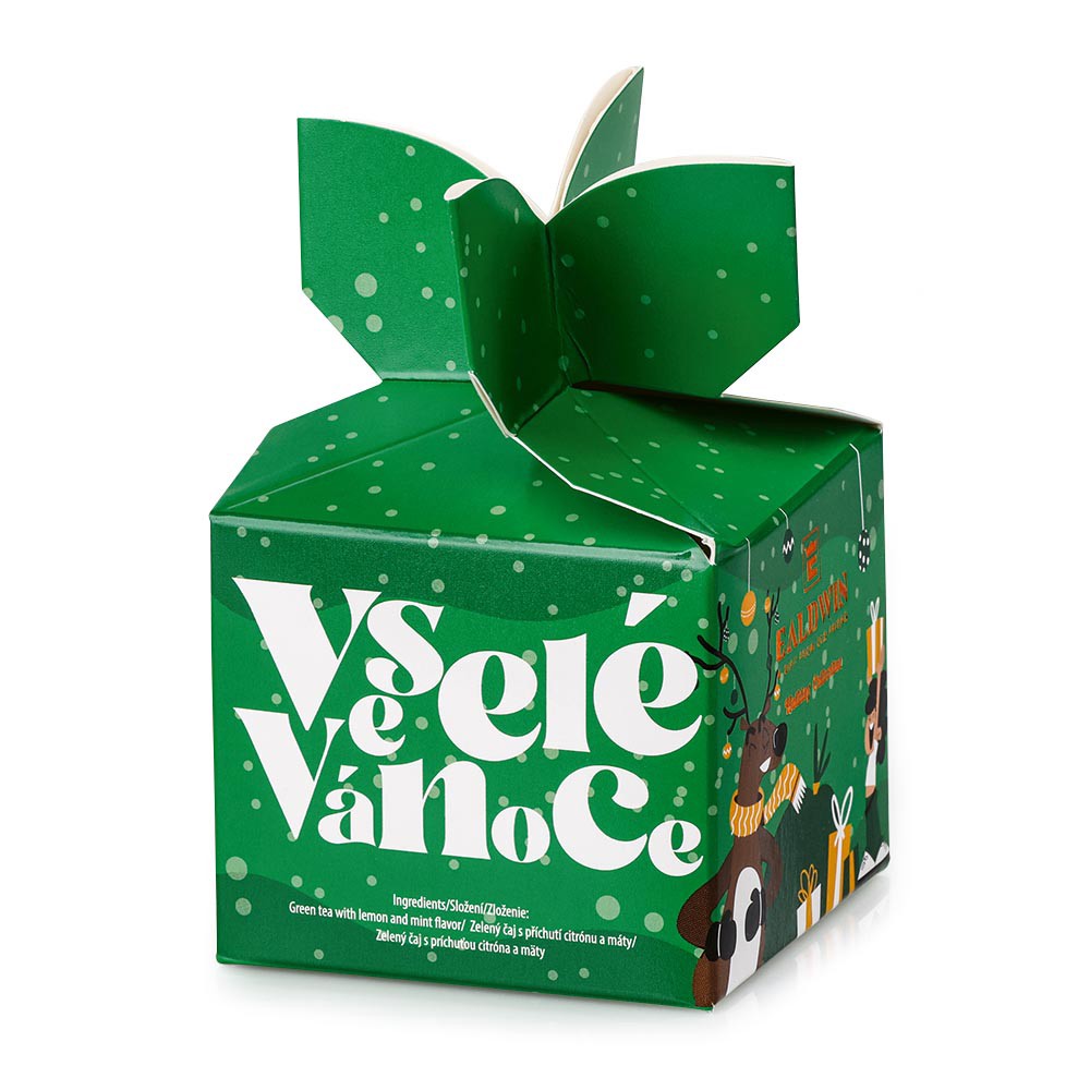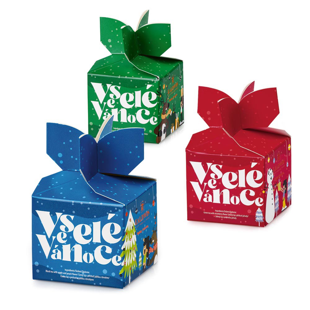 Darčeková krabička s čajmi Ealdwin, 5 vrecúšok. Modrá škatuľka obsahuje čierny čaj s príchuťou jabĺk a broskýň, červená škatuľka obsahuje zelený čaj s jahodovou príchuťou a zelená škatuľka obsahuje zelený čaj s príchuťou citrónu a mäty. Dodáva sa v mixe, farbu nie je možné vybrať.