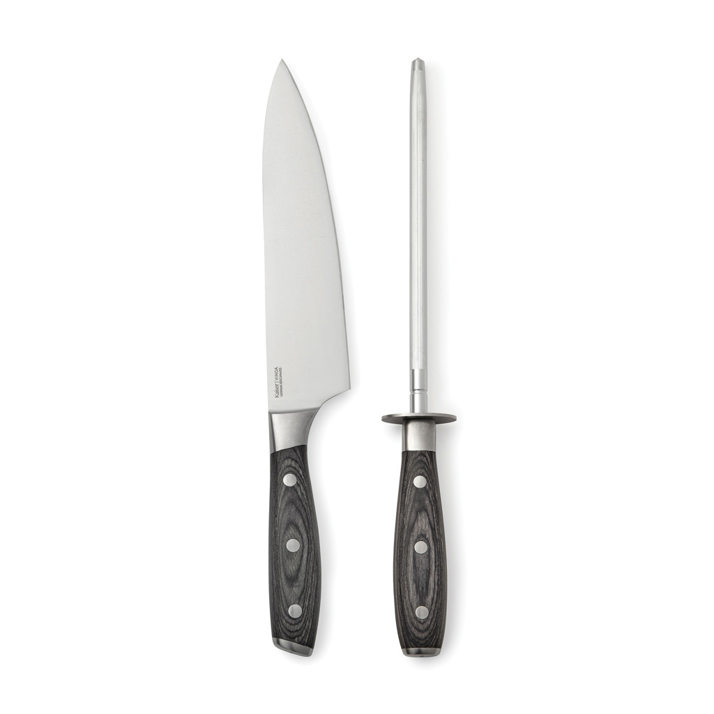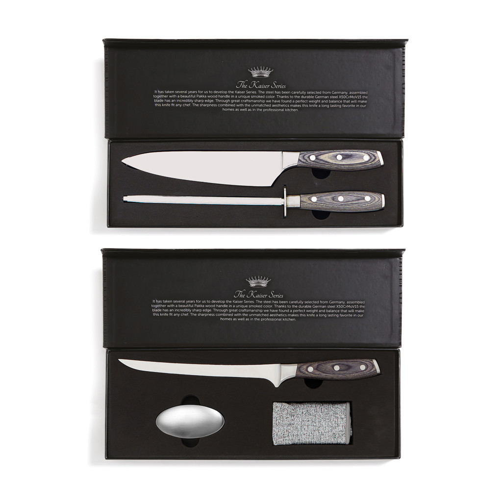 Porcovací nôž a brúska z radu Kaiser. Nôž je vyrobený z nemeckej ocele X50CrMoV15 a rukoväť je z dreva pakka. Vďaka ľahko uchopiteľnej rukoväti a vynikajúcemu vyváženiu čepele je práca s nožom pohodlná a jednoduchá. Čepeľ je vďaka prirodzeným vlastnostiam nemeckej ocele odolná voči škvrnám a okrem občasného brúsenia nevyžaduje žiadnu starostlivosť. Porcovací nôž: 20 cm čepeľ. Brúska: 33 cm.