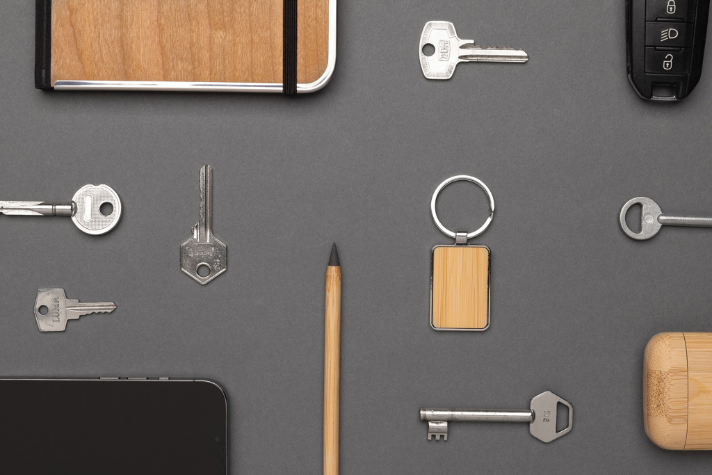 Kľúčenka v hranatom tvare vyrobená z RCS recyklovanej zliatiny zinku a bambusu. RCS certifikácia zaisťuje garanciu použitia recyklovaného materiálu vďaka transparentnému prehľadu nad dodávateľským reťazcom. Celkový podiel recyklátu podľa váhy produktu: 76 %. Balené v papierovom obale.