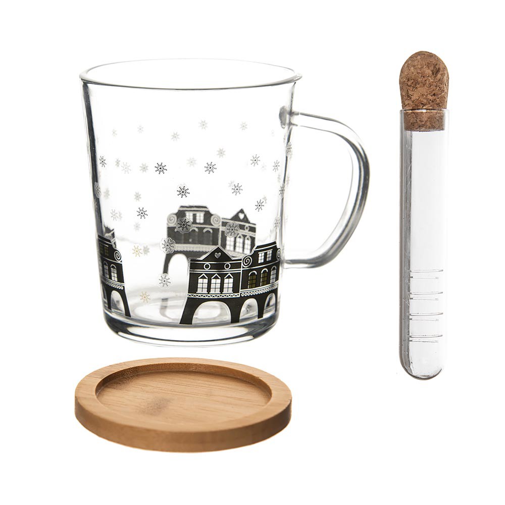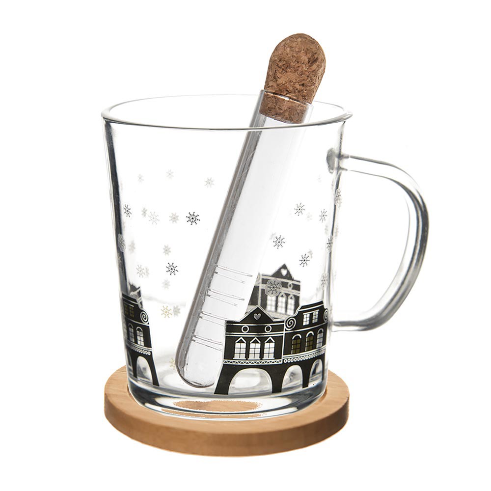 Sada skleneného hrnčeka s lúhovačom a bambusovým tanierikom. Objem 420 ml. Dodávané v krabičke.