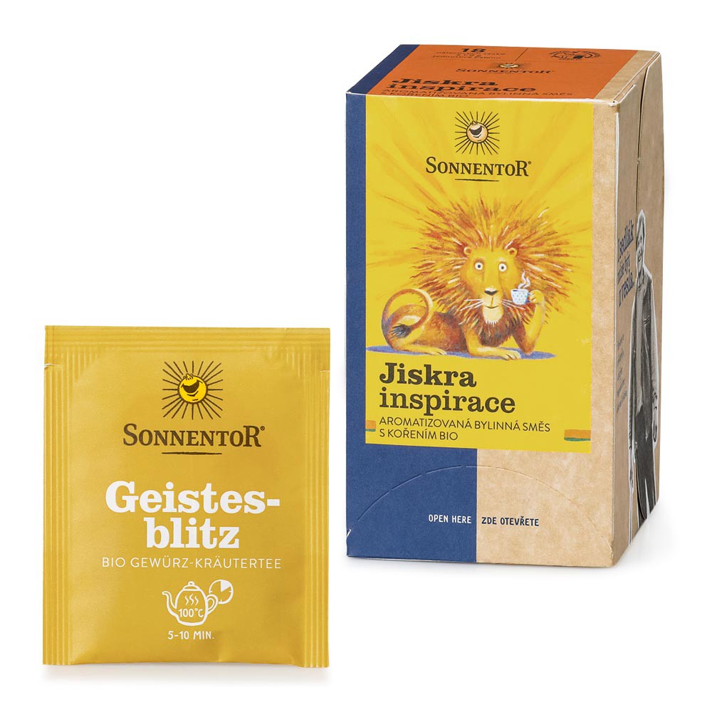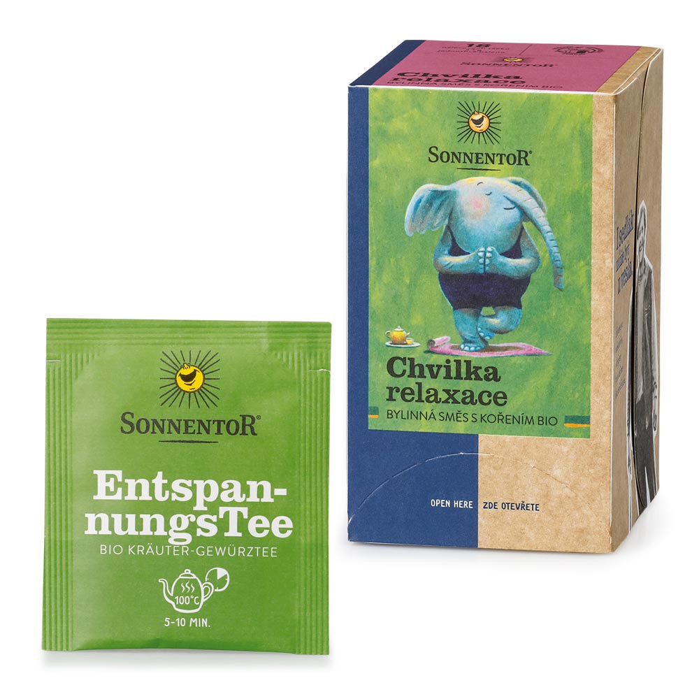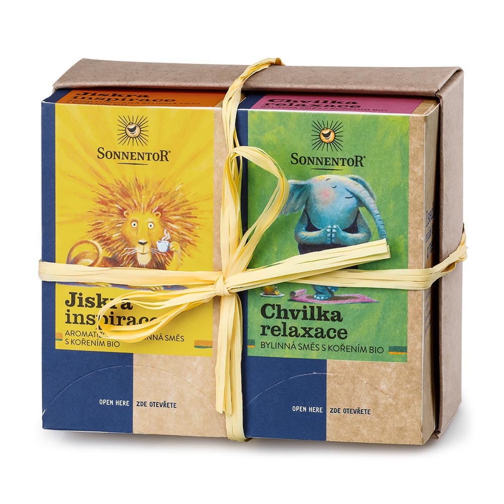 Darčeková sada 2 organických čajov Sonnentor. Obsahuje bylinné čaje Iskra inšpirácie a Chvíľka relaxu, 2× 18 vrecúšok.