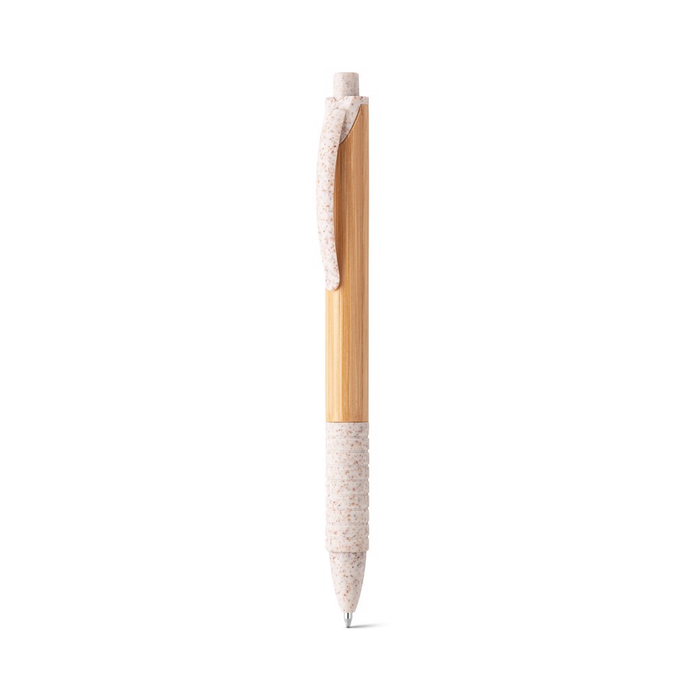Bambusové guľôčkové pero so sponou, protišmykovou rukoväťou a farebnými prvkami z pšeničných vlákien a ABS. Keďže výrobok je vyrobený z prírodných materiálov, farba a výsledok tlače sa môžu medzi výrobkami líšiť. ø11 x 142 mm