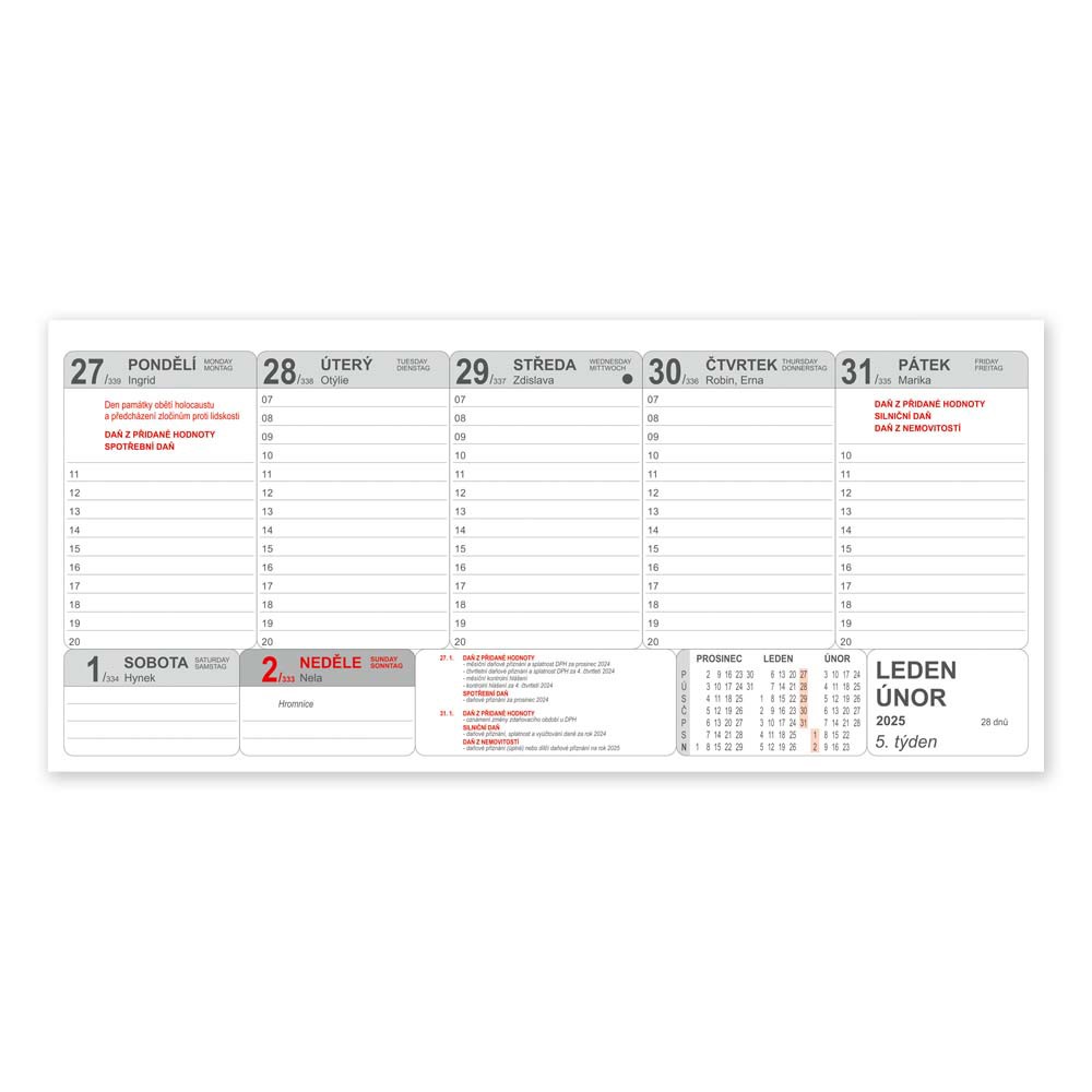 Týždenný stolový kalendár, 60 strán s daňovými informáciami, 3-mesačným českým kalendáriom a odpočtom dní na každej strane. Infostrany obsahujú plánovací a menný kalendár, súhrn obvyklých daňových povinností, dôležité telefónne čísla a iné. Listy: ofset biely 80 g/m².List 320x145 mm, kalendár 320x175 mm.