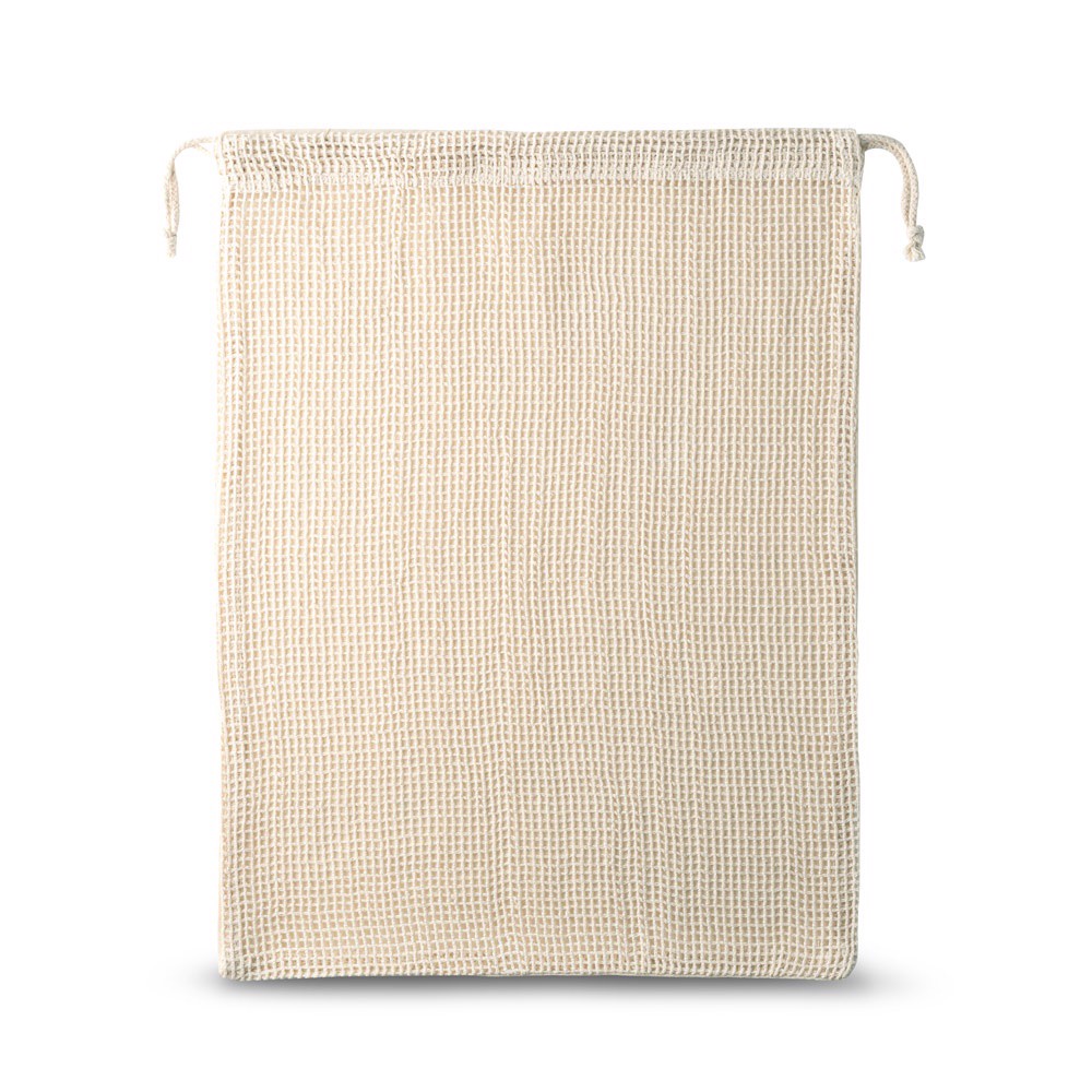 Vrecko zo 100% bavlny (120 g/m²) so sieťovinou zo 100% bavlny na prednej strane (100 g/m²). S bavlnenou šnúrkou na zapínanie. Ideálne na nosenie jedla. 300 x 400 mm