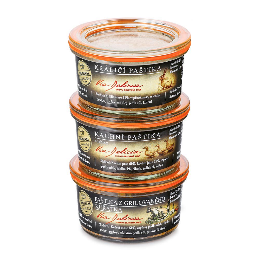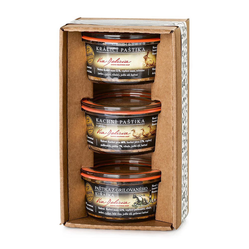 Darčeková sada s výberom sedliackych paštét. Sada obsahuje králičiu paštétu, grilovanú kuraciu paštétu a kačaciu paštétu s jablkami, 3× 130 g.