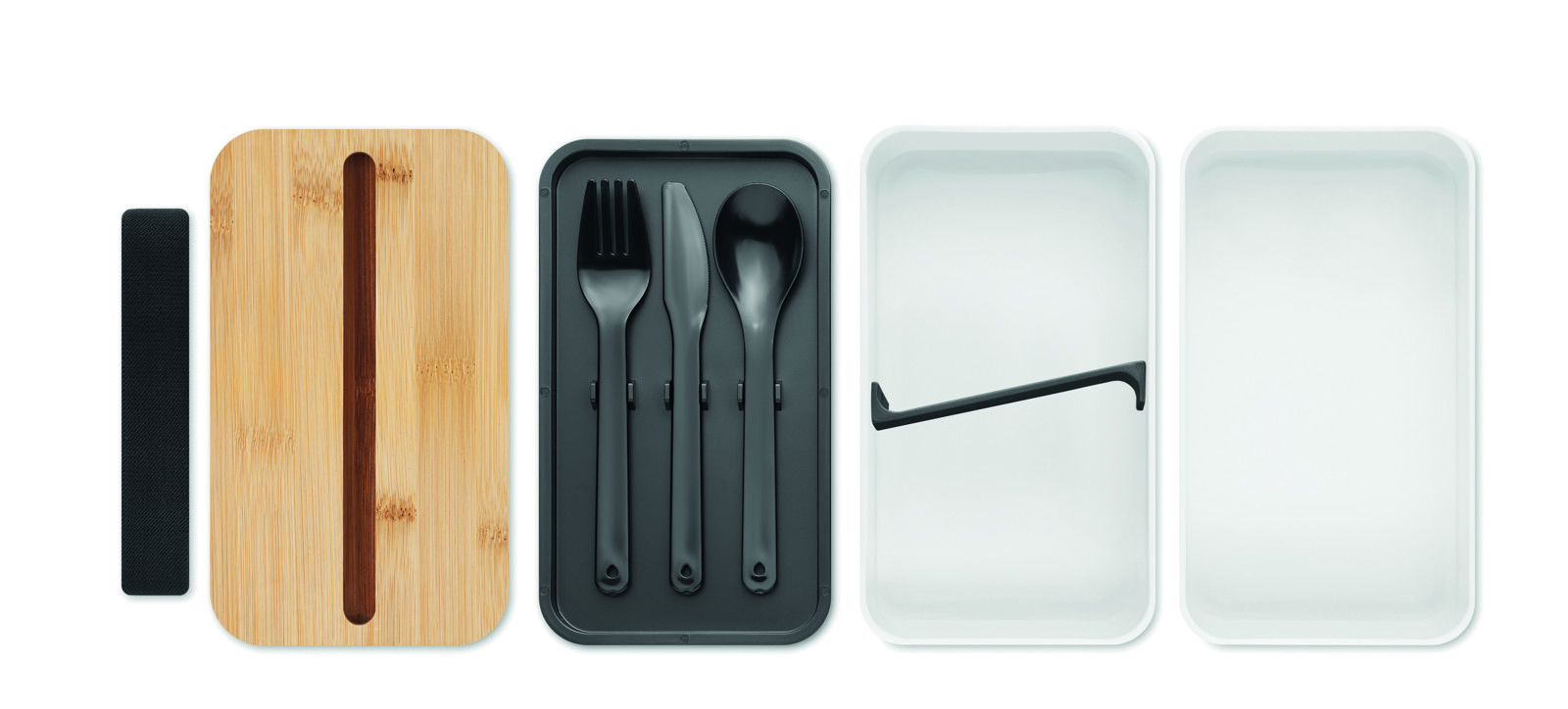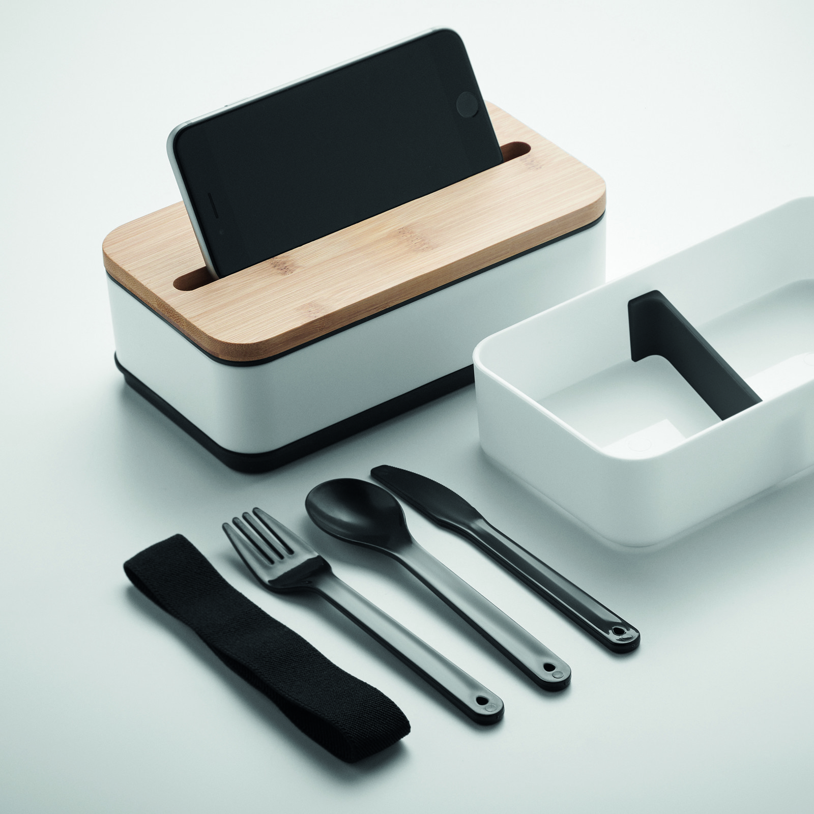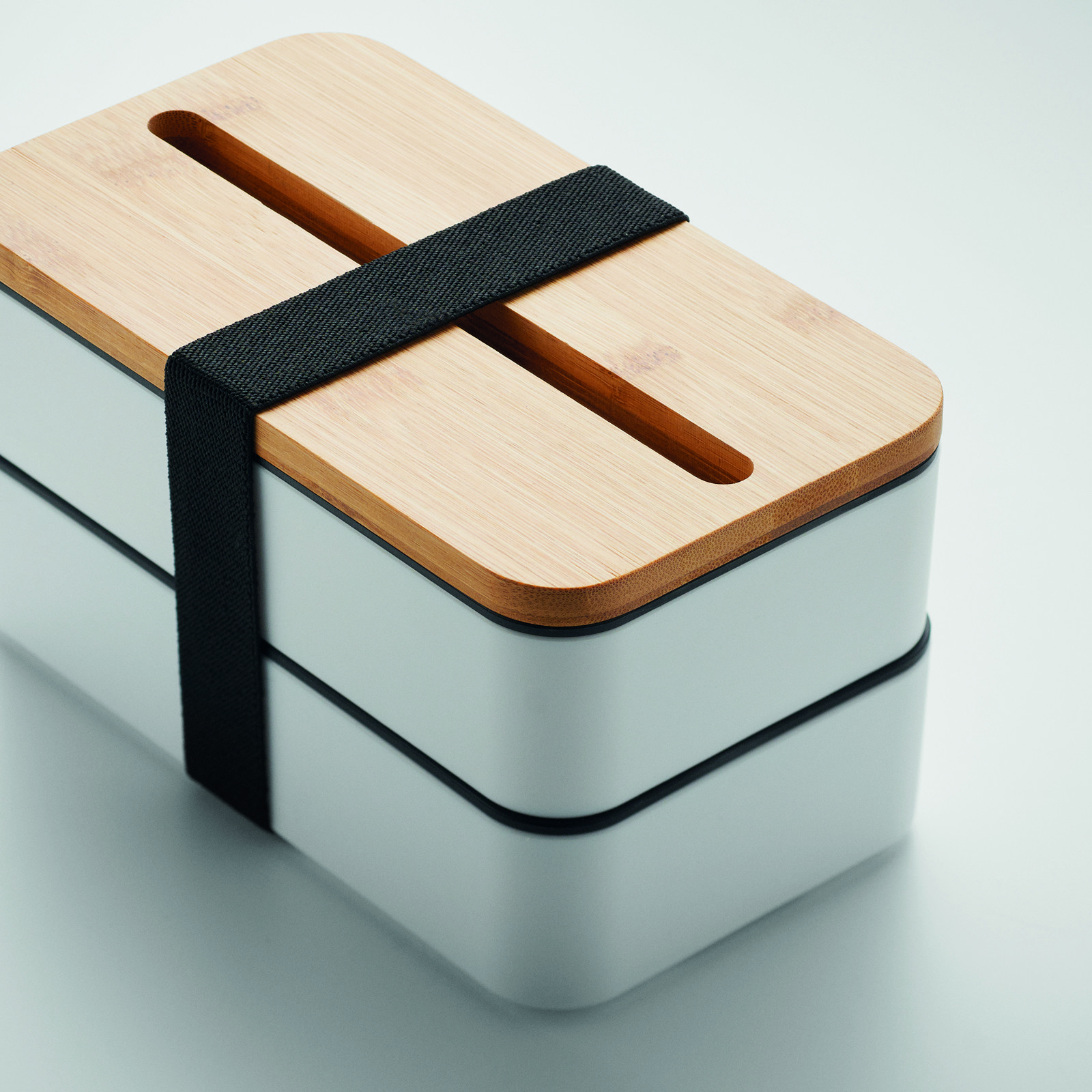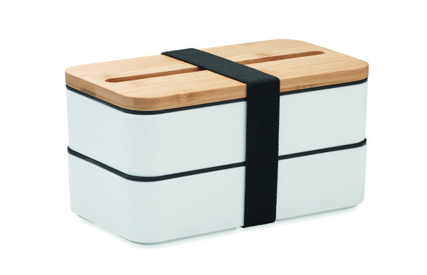 Dvojposchodový box na jedlo vyrobený z recyklovaného PP s odnímateľnou priehradkou a 3 príbormi. Uzatváranie pomocou pásky. Bambusové veko slúži aj ako držiak na telefón. Objem: 400 ml (2x). Bambus je prírodný materiál, môžu sa vyskytnúť mierne odchýlky vo farbe, zdobení a veľkosti. Netečie. V katalógu Reda je uvedená pod označením R5481 pod názvom BENTO.