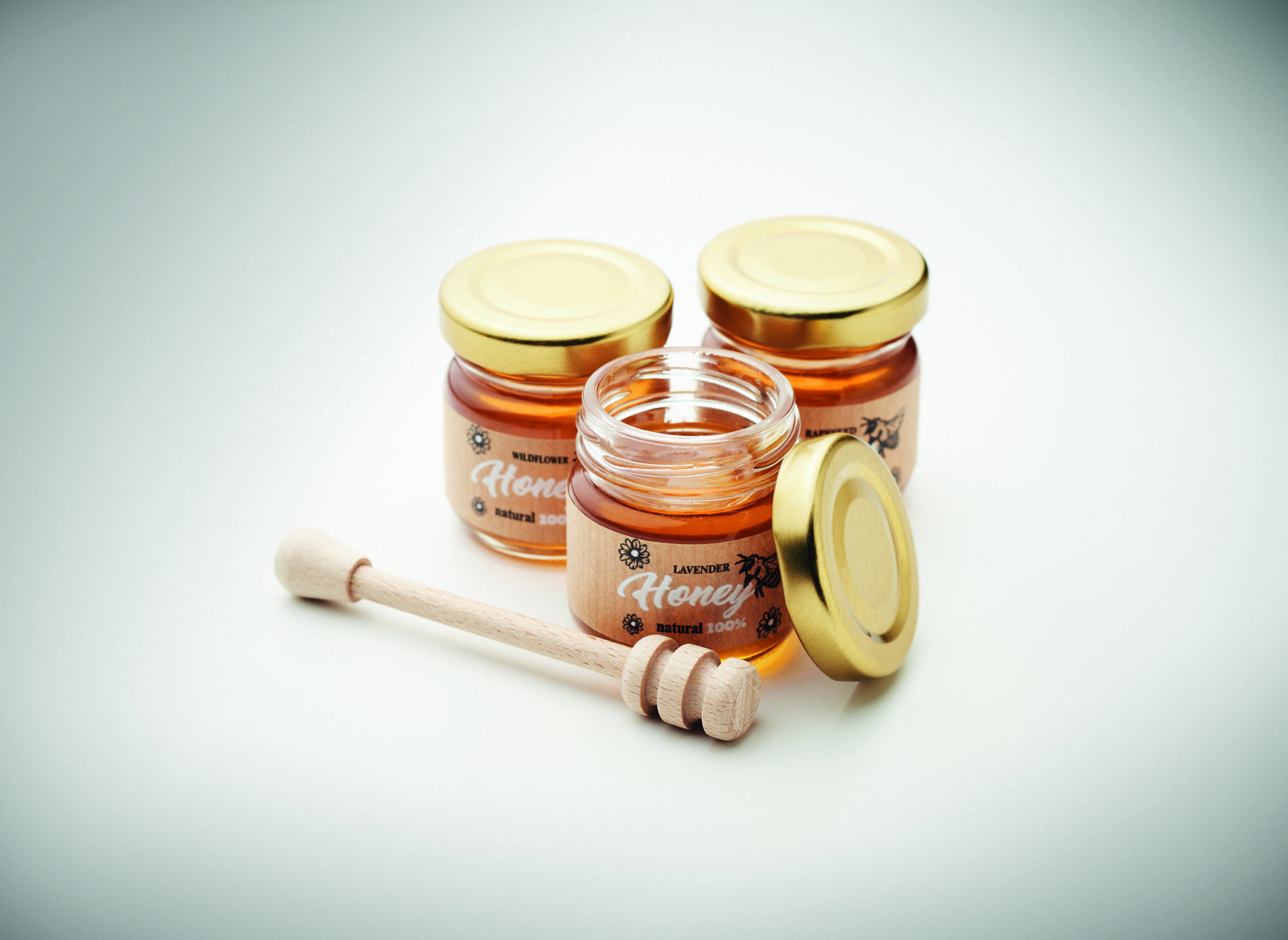 Súprava 3 nádob na med (každá po 50 g) s drevenou naberačkou na med. Med z lúčnych kvetov, levandule a repky. Dodáva sa v kraftovej papierovej škatuli. Vrátane semienok lúčnych kvetov. Vyrobené v EÚ.