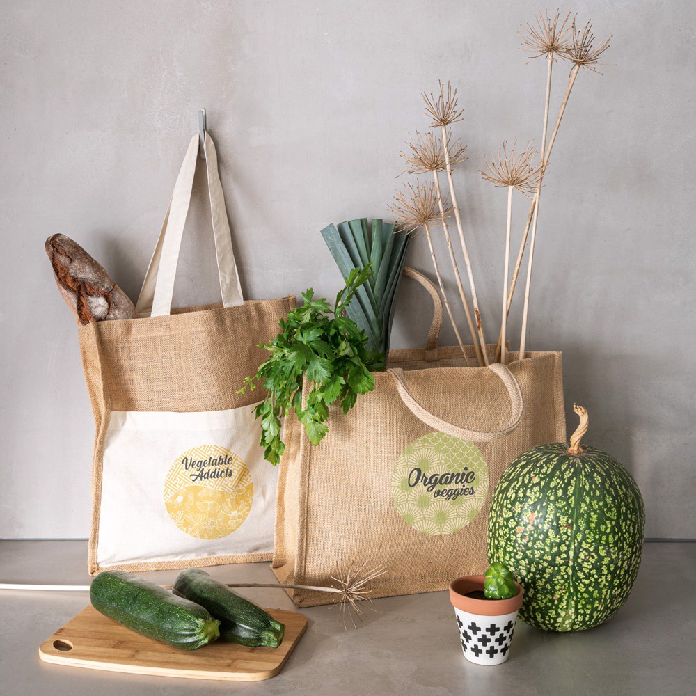 Nákupná taška z juty (360 g/m²) s laminovaným vnútrom a krátkymi ramennými popruhmi. 430 x 340 x 175 mm