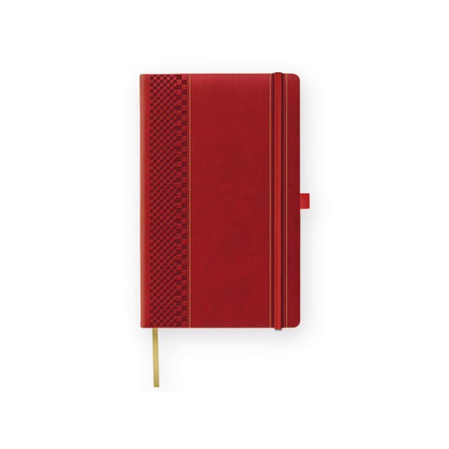 Poznámkový linajkový zápisník s gumičkou, vlepeným vreckom a pútkom na písacie potreby, 240 strán, formát A5. Zápisník má zlaté okraje stránok, modrá verzia zápisníka má strieborné okraje.