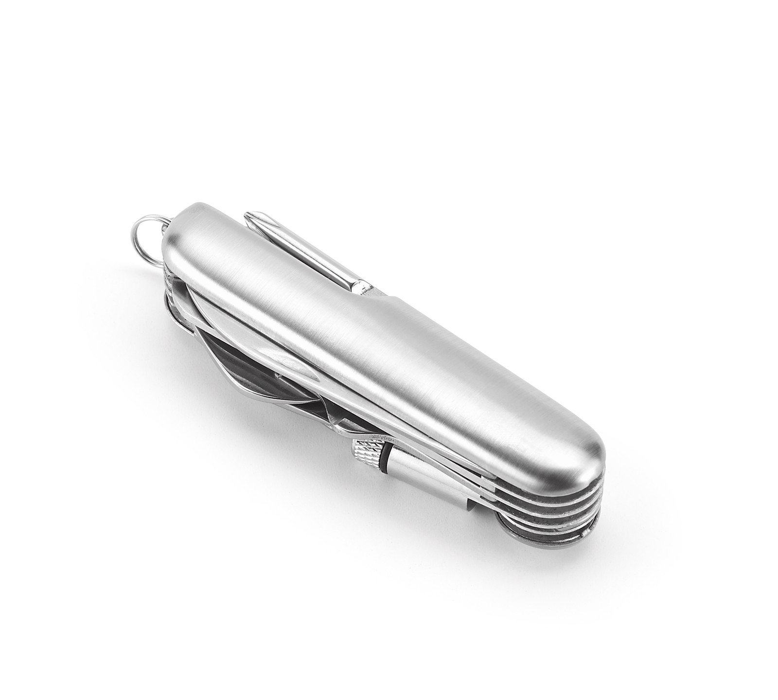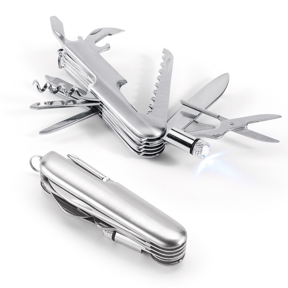 Multifunkčný vreckový nôž z nehrdzavejúcej ocele a kovu s mini LED baterkou. Vreckový nôž má 11 funkcií: krížový skrutkovač, dierovač, pilník, očko na šitie, vývrtka, LED svetlo, nožnice, pílka na drevo, nôž, otvárač na fľaše a konzervy. Obsahuje 3 batérie AG10. 90 x 20 x 27 mm