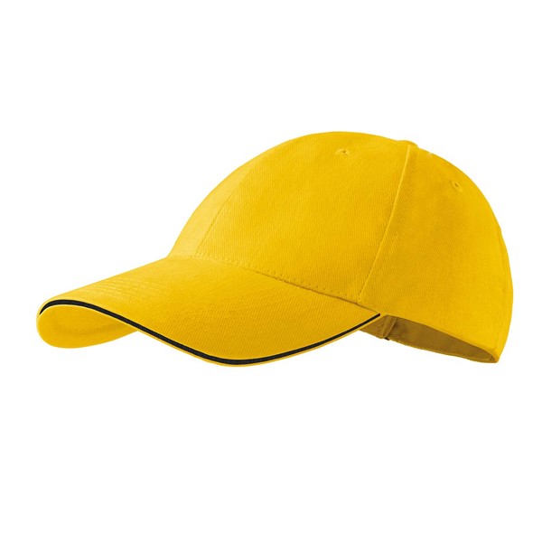 Šesťpanelový strih, vystužené 2 predné panely, prešívaný, ľahko prehnutý šilt s konstrastným prúžkom, obšité vetracie otvory, potiaca páska, veľkosť nastaviteľná mosadzným klipom.