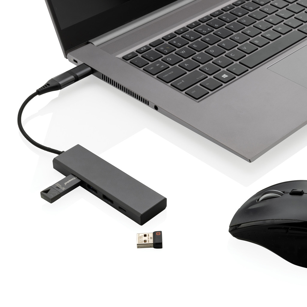 USB rozbočovač s 3 USB A 2.0 a 1 USB C portami. Vyrobený z recyklovaného hliníka, ABS, TPE a PET s RCS certifikáciou. RCS (Recycled Claim Standard) je globálny štandard, ktorý umožňuje overiť použitie recyklovaného materiálu v produkte naprieč celým dodávateľským reťazcom. Celkový podiel recyklátu podľa váhy produktu: 75 %. Hliník pri recyklácii nijako nestráca svoje vlastnosti, je možné ho tak opakovane recyklovať. Integrovaný 10 cm kábel z RCS TPE/PET s duálnym konektorom USB A/USB C. Balené v FSC® darčekovej krabičke. Výrobok je kompletne bez PVC. Podporuje prenos dát.