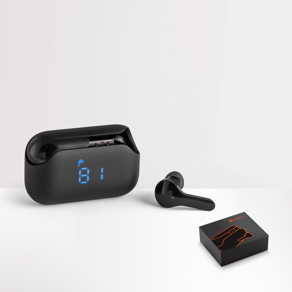 Vodotesné slúchadlá so vstavaným mikrofónom. Súčasťou balenia je nabíjacie puzdro s LED indikátorom úrovne nabitia a dotykové ovládanie pre príjemnejší a efektívnejší zážitok.Materiál: ABSBezdrôtový prenos: BT V5'0IPX4Kapacita: 800 mAhFunkcie: handsfree volanie a ovládanie playlistu z mobilného zariadeniaObsah balenia: nabíjací kábel USB-CBalenie: darčeková krabička 69 x 42 x 25 mm