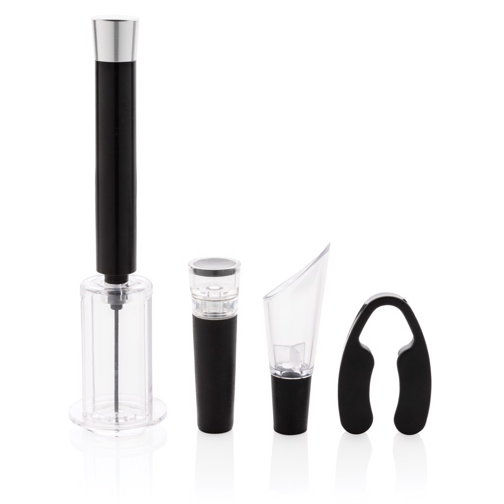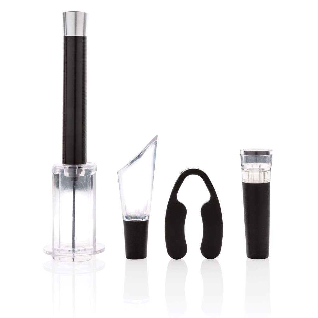 Ideálna sada pre milovníkov vín. Obsahuje tlakovú vývrtku, nôž na fóliu, zátku s vákuovou pumpou a dekantovací lievik. Balené v luxusnej darčekovej tube.