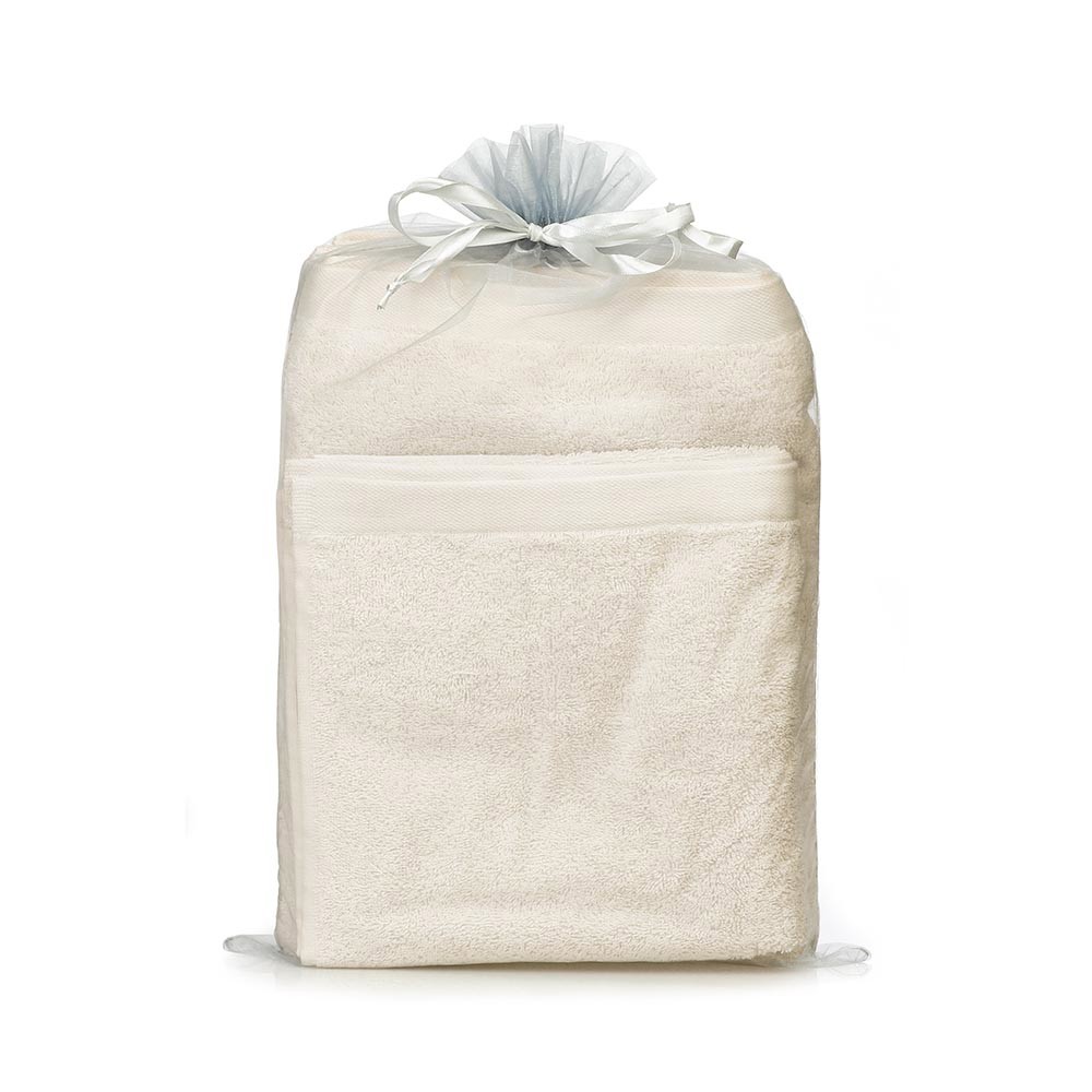 Súprava uterákov a osušiek zo 100% prírodnej organickej bavlny (450 g/m²). Vďaka tomuto bavlnenému vláknu sú výrobky savejšie, priedušnejšie, nespôsobujú alergické reakcie a sú odolnejšie. Balené v organzovom vrecku. Objednávky sú možné v minimálnom množstve 20 súprav.